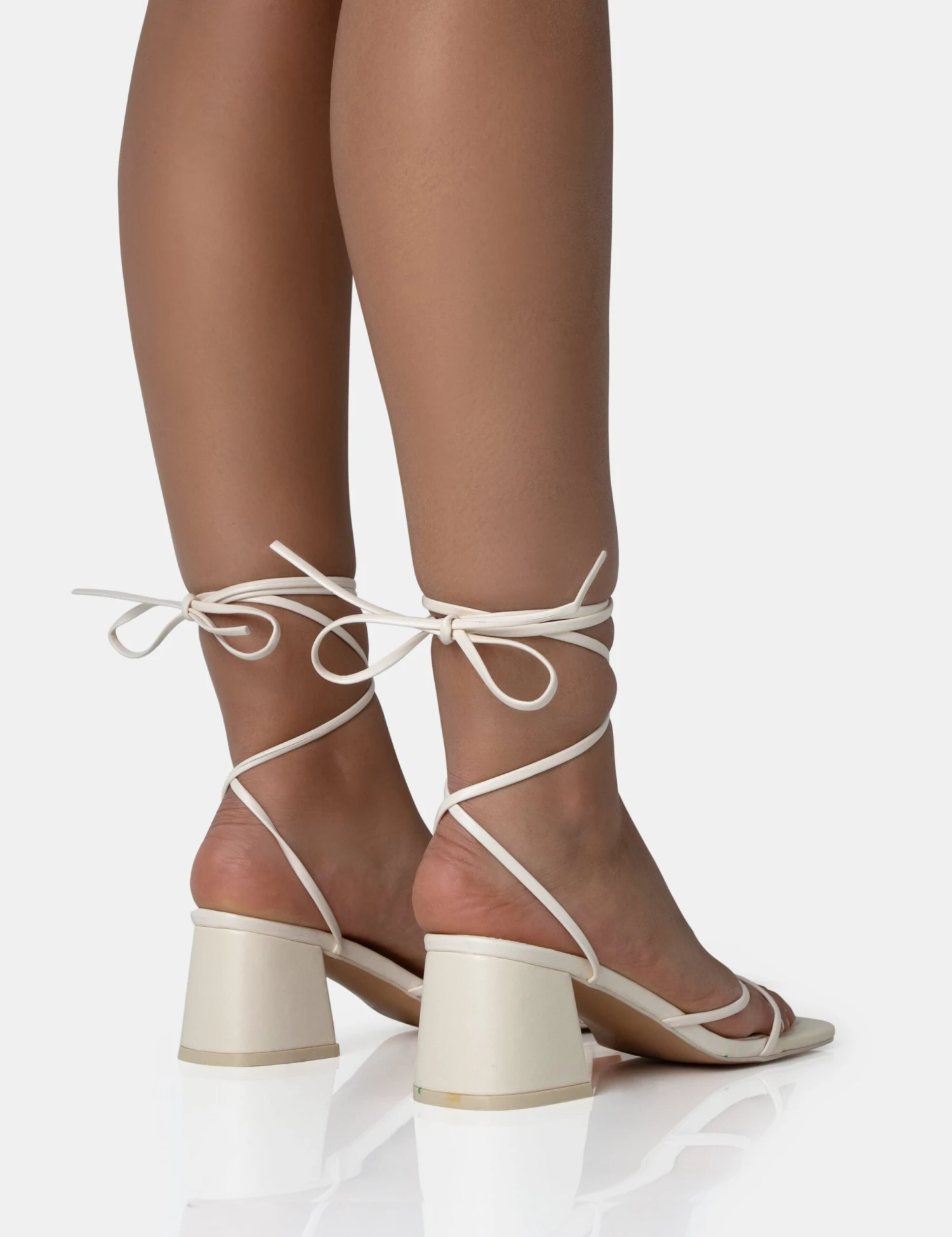 Casey Ecru Strappy Lace Up Square Toe Low Block Heel Sandals