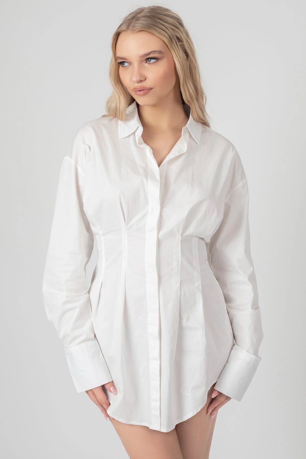 The perfect night out shirt dress in white featuring a flattering corset waist detail.