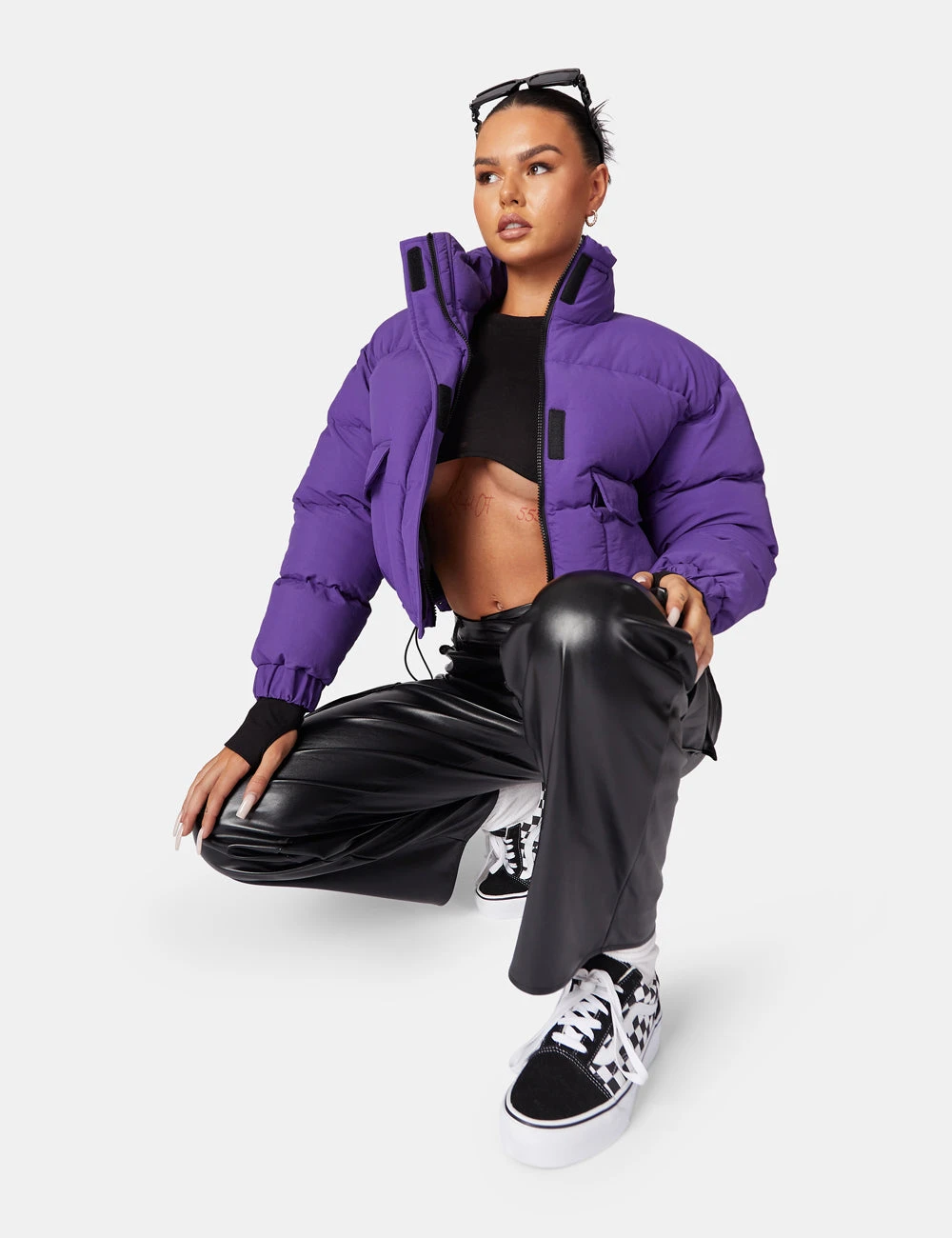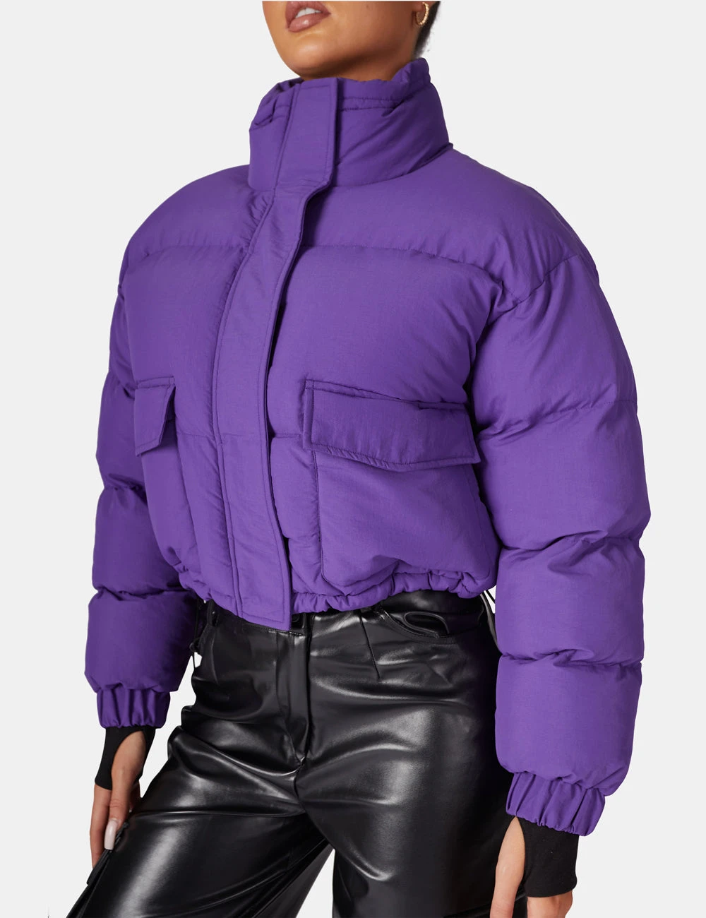 An cropped puffer made with a rich purple material . The model pictured is wearing a UK 8