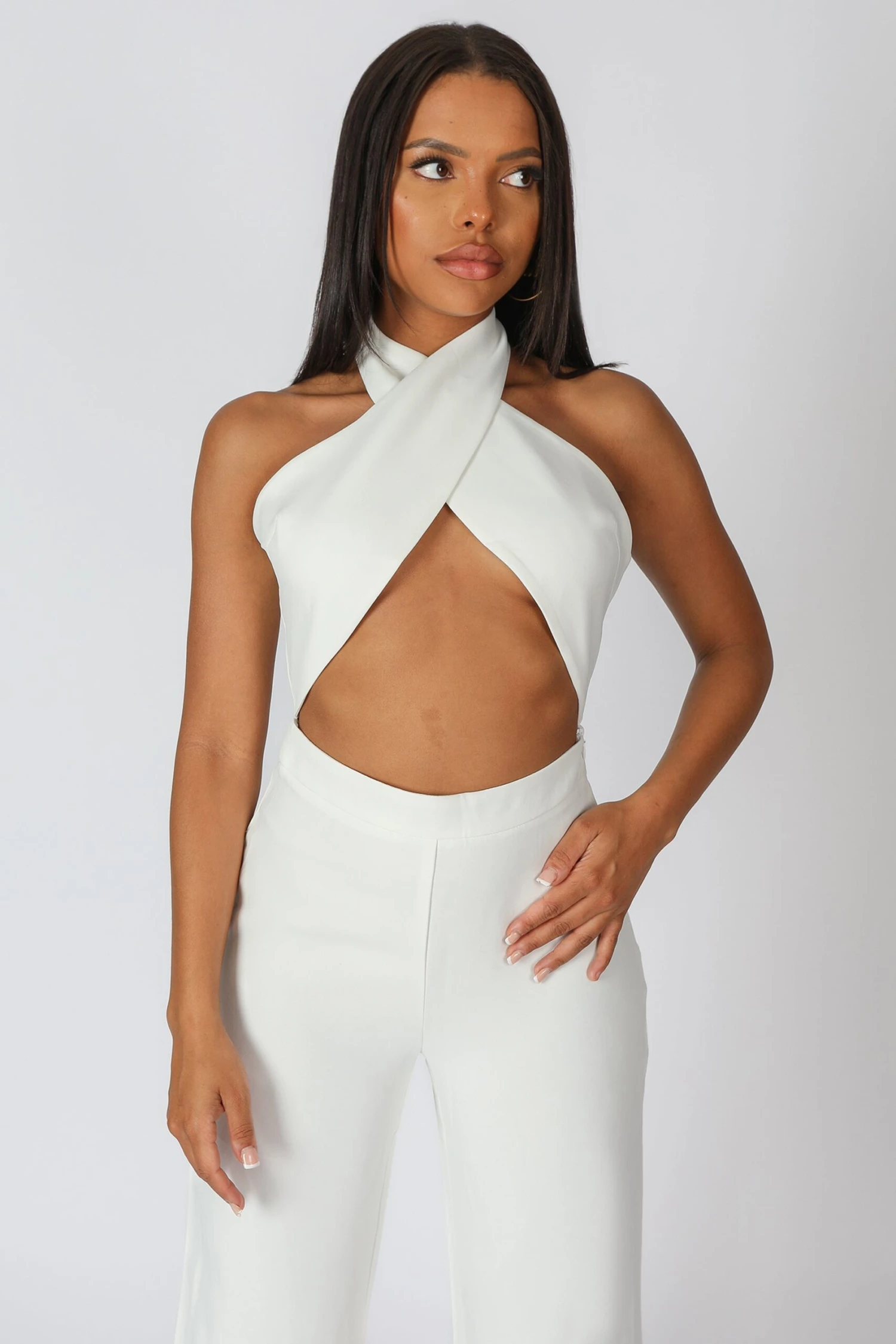 A BACKLESS WHITE CROSS FRONT HALTERNECK JUMPSUIT WITH WIDE LEG TROUSERS