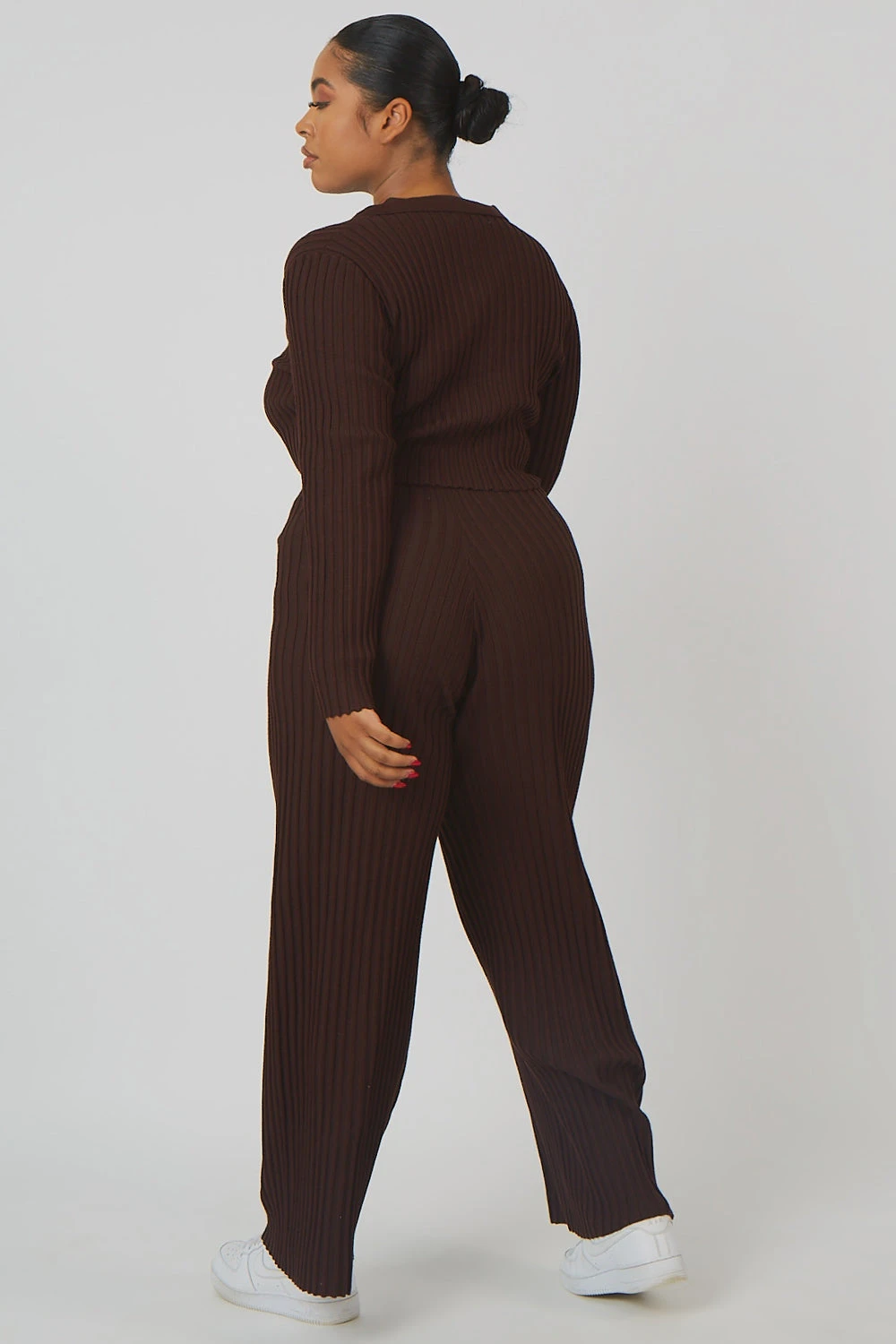 A ribbed knitted long sleeve crop top with a lace up detail on the front in chocolate