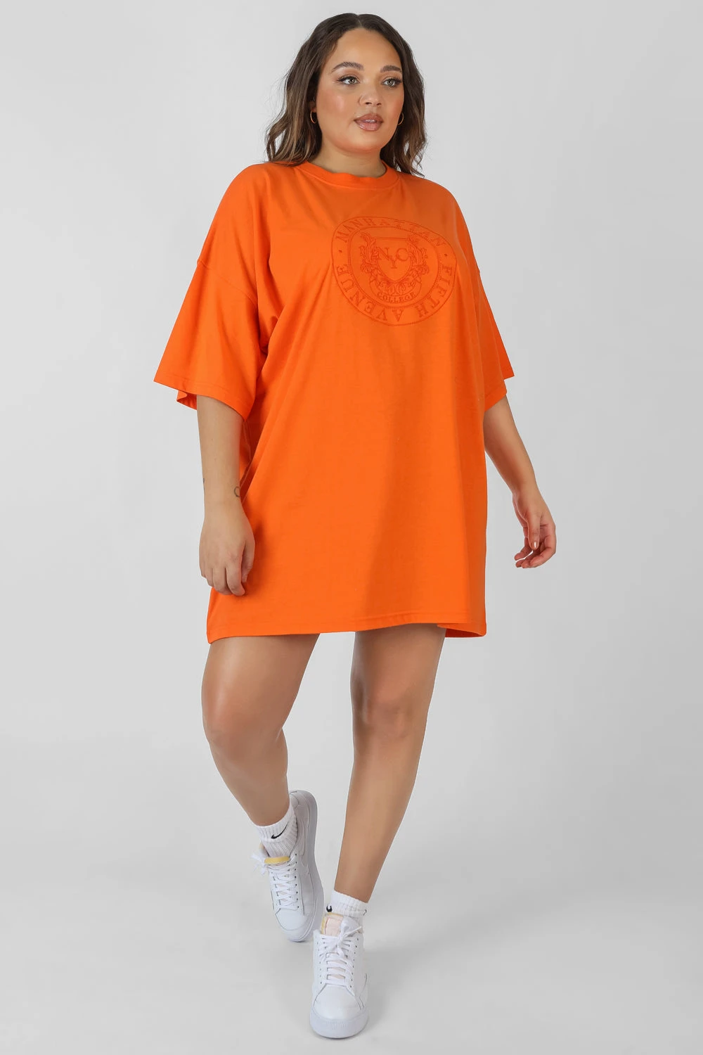 An oversized fit t-shirt dress in orange with tonal embroidery.