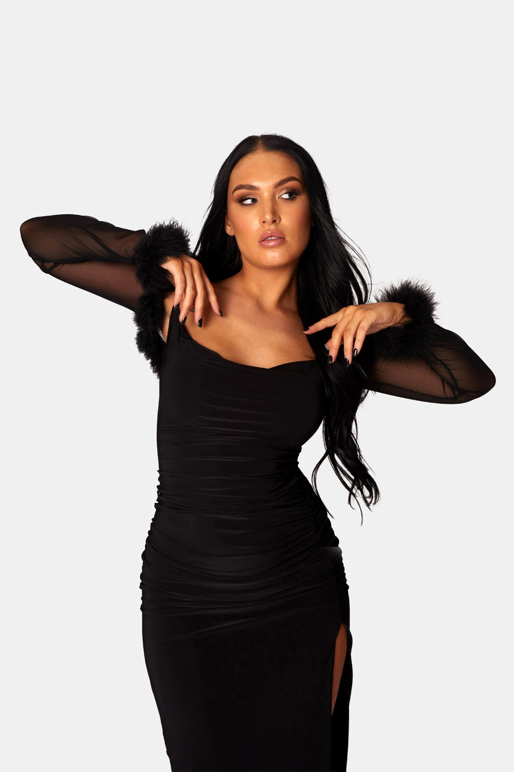 MESH SHRUG WITH BLACK FEATHER TRIM HEM.