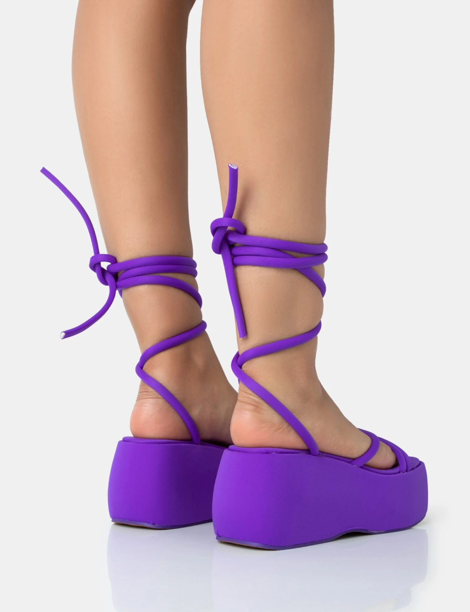 Can’t fight the moonlight….Say hello to Full Moon Purple Nylon Lace Up Chunky Platform Sandals. – the perfect rave shoes you need to elevate your festival outfit! These sandals feature a striking color, a nylon material, chunky platform soles. These Full Moon sandals are not only perfect for raves and festivals but also make a great addition to any edgy and trendy wardrobe. So, whether you’re heading to a music festival or simply looking to add some extra flair to your everyday outfit, these platform sandals are the perfect choice!