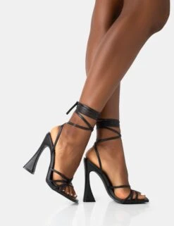 Wiley Black Pu Strappy Lace Up Square Toe Sculptural Block Heels