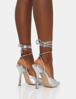 Vada Silver Mirror Slingback Lace Up Pointed Court Stiletto Heels