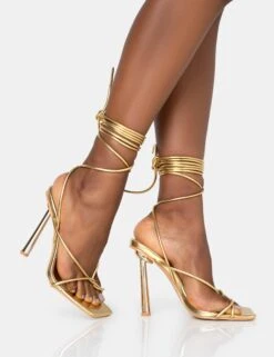 Lacey Gold Metallic Square Toe Strappy Lace Up Stiletto Heels