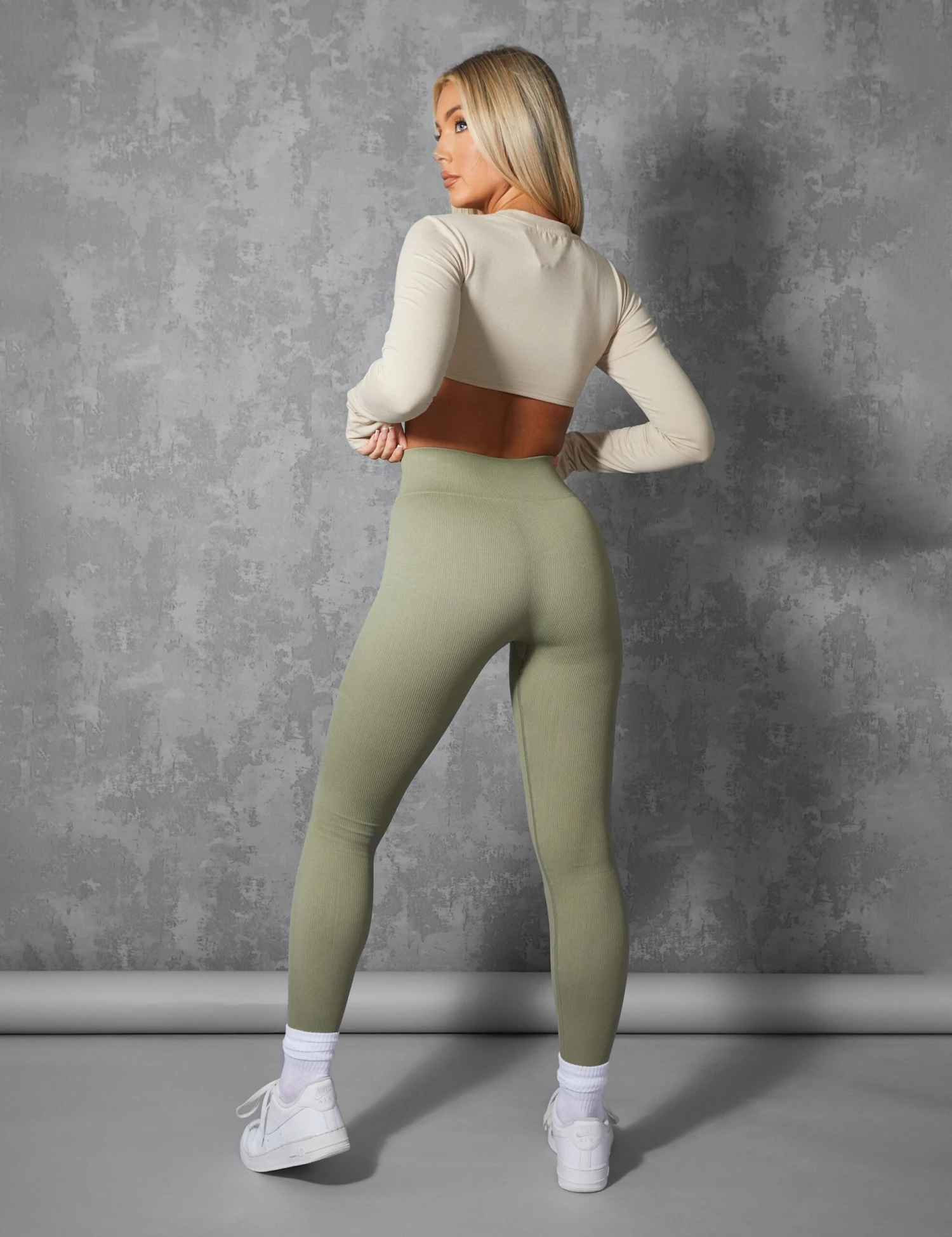 SEAMLESS RIBBED LEGGINGS IN KHAKI GREEN WITH SUBTLE KAIIA BRANDING ON THE FRONT.