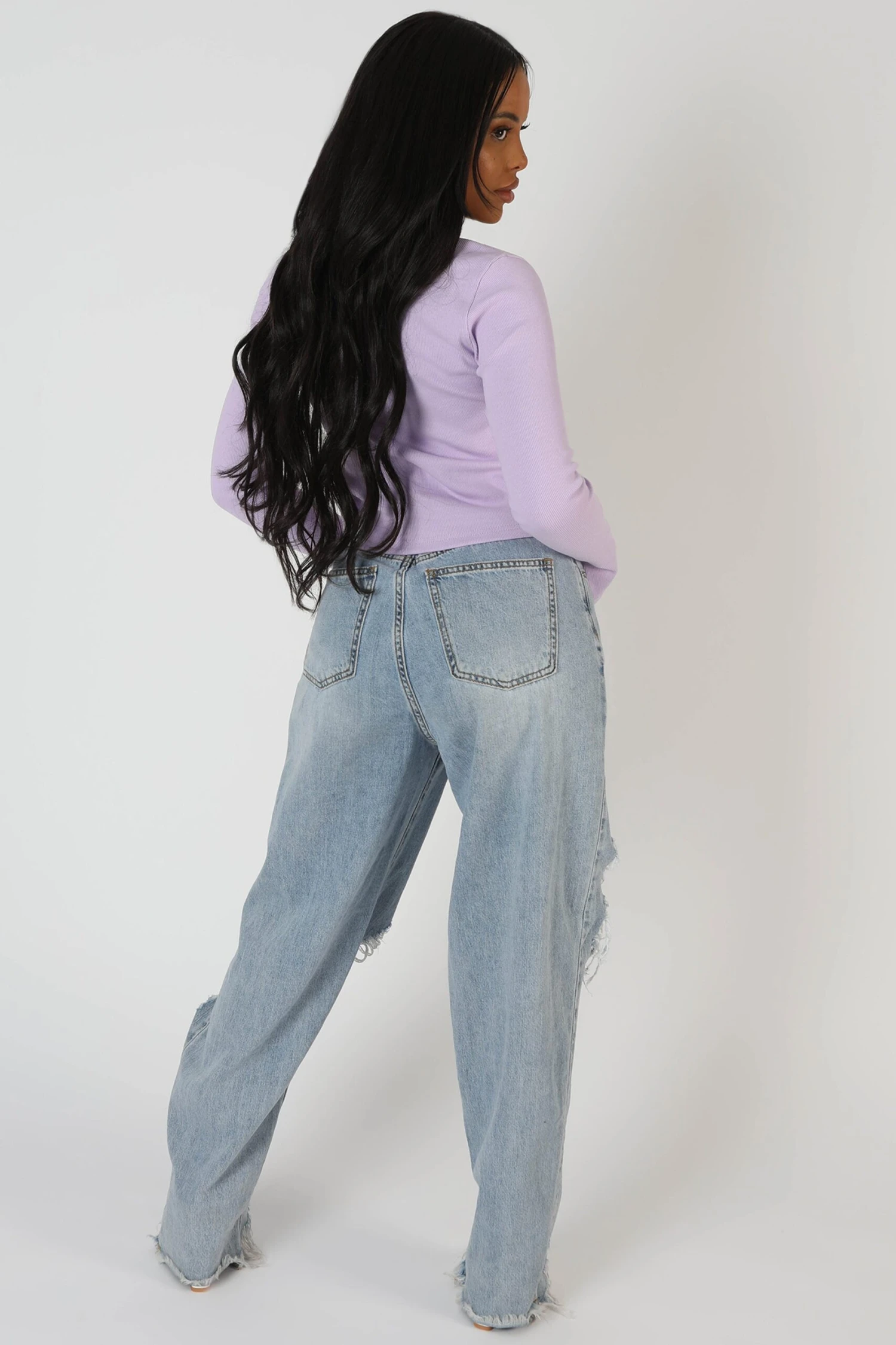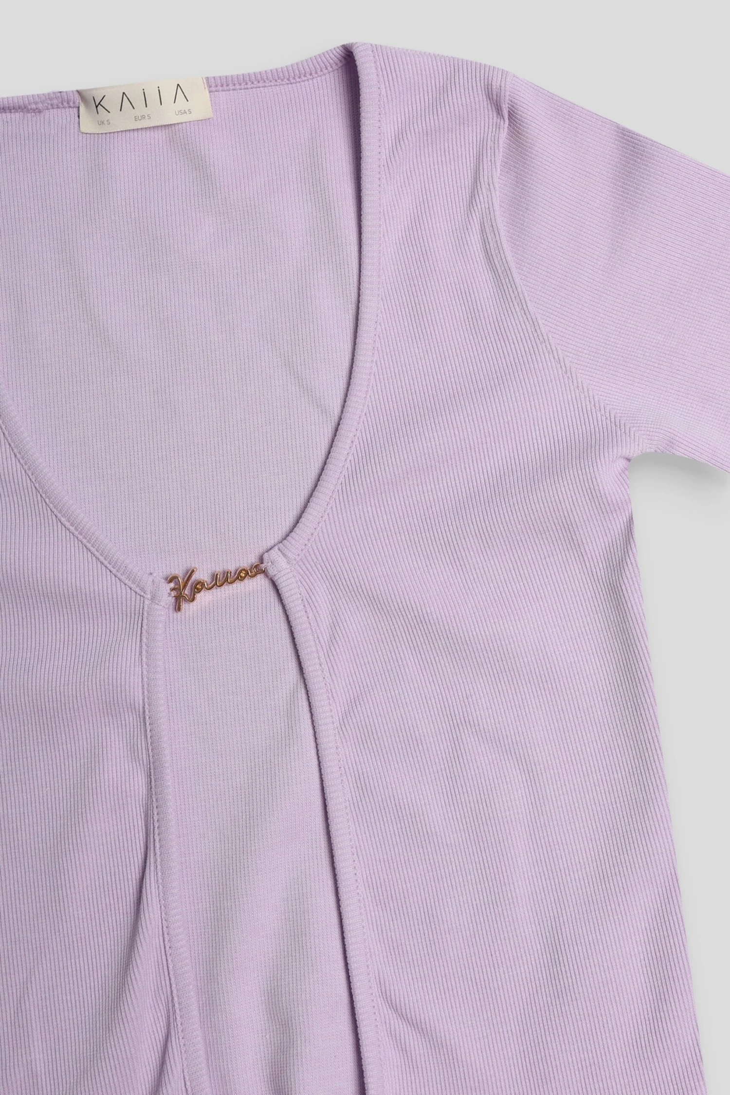 A RIBBED LONGER LINE CROP TOP THAT IS CARDIGAN STYLE IN LILAC WITH LONG SLEEVES AND A KAIIA TRIM PIN HOLDING IT TOGETHER