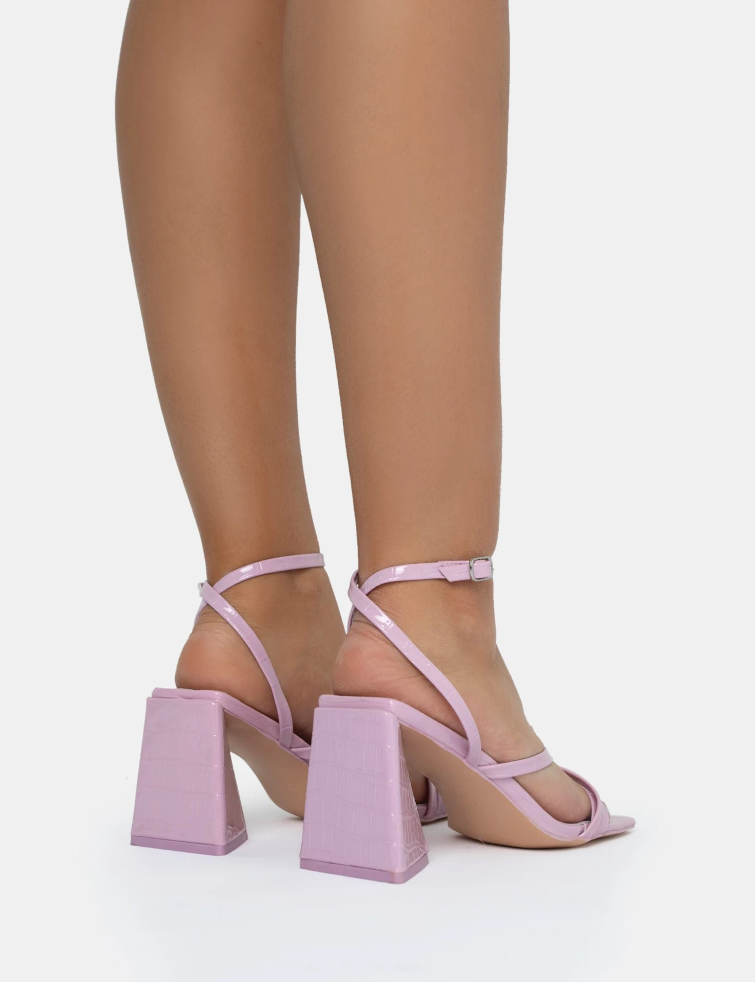 Make that bold statement girl – featuring Enya in purple satin with multiple buckle detailed straps, a square toe on an extreme platform block heel.