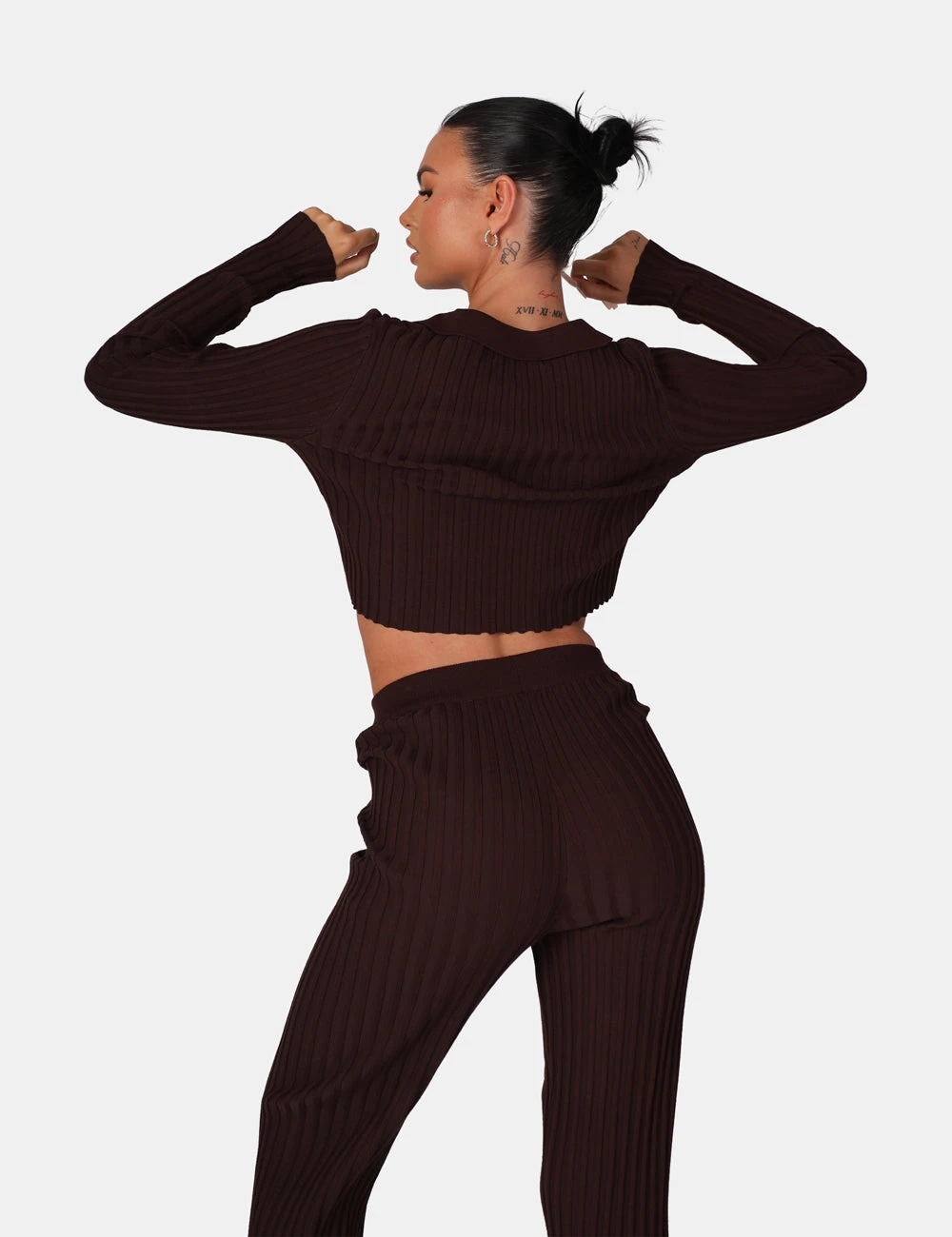 A ribbed knitted long sleeve crop top with a lace up detail on the front in chocolate