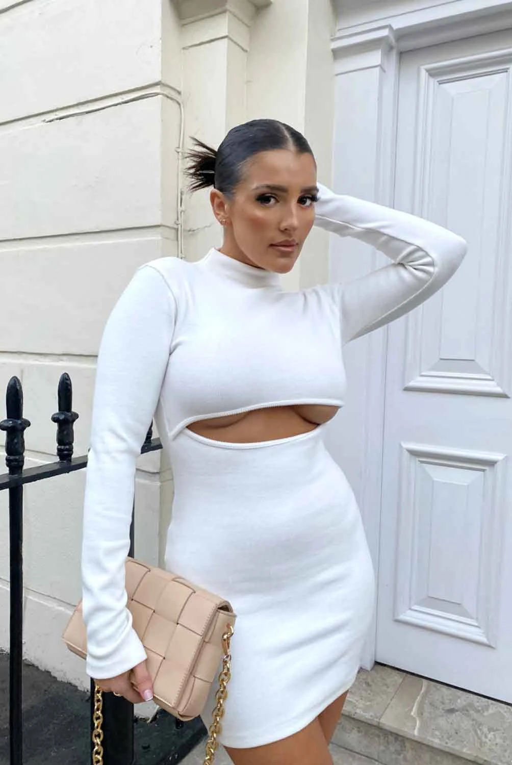 A long sleeve ribbed mini bodycon dress in white with a cut out on the front with a slight underbust detail.