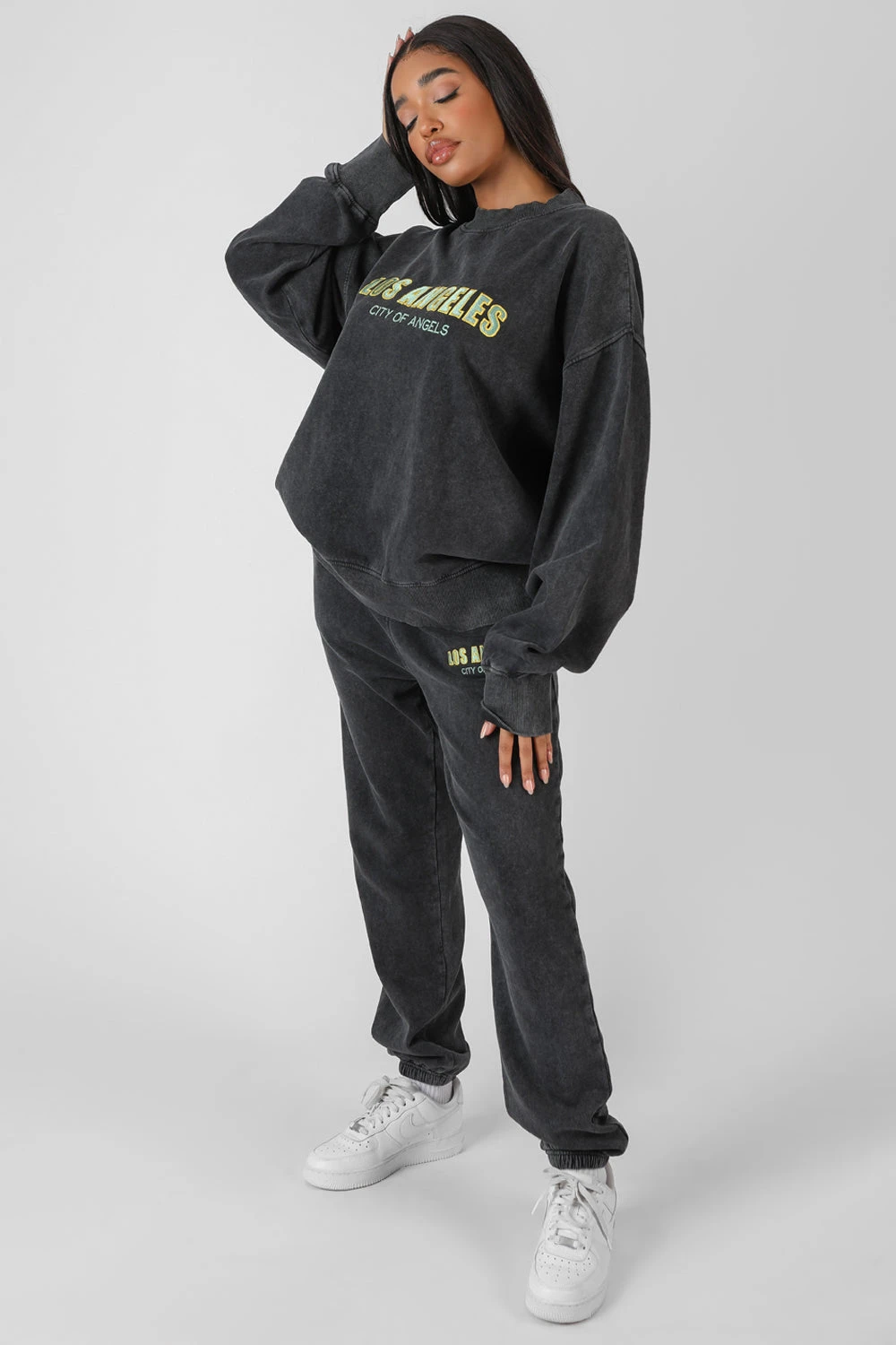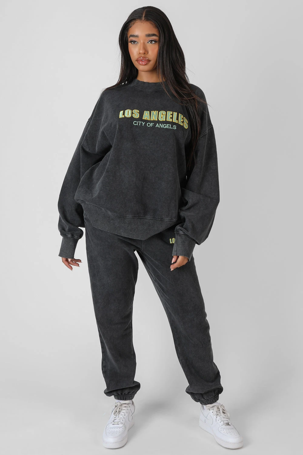 An oversized fit sweatshirt in grey acid wash with ‘LOS ANGELES’ embroidered on the front in yellow.