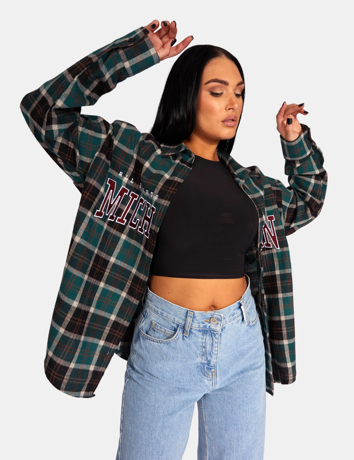 AN OVERSIZED FIT CHECK SHIRT IN FOREST GREEN WITH ‘MICHIGAN’ PRINTED ON THE FRONT.