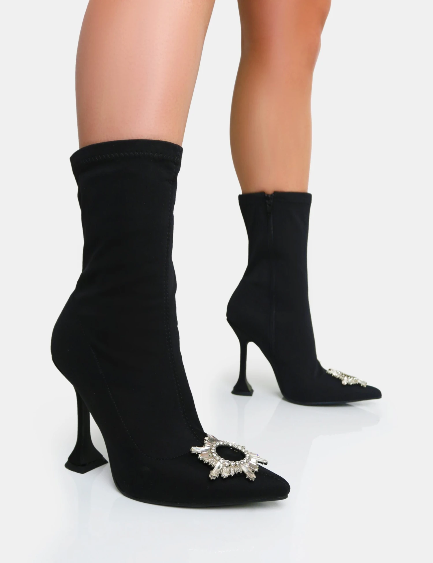 Make that bold statement girl – featuring Modena in black nylon with diamante broach, a pointed toe sock boot on an cake stand heel.
