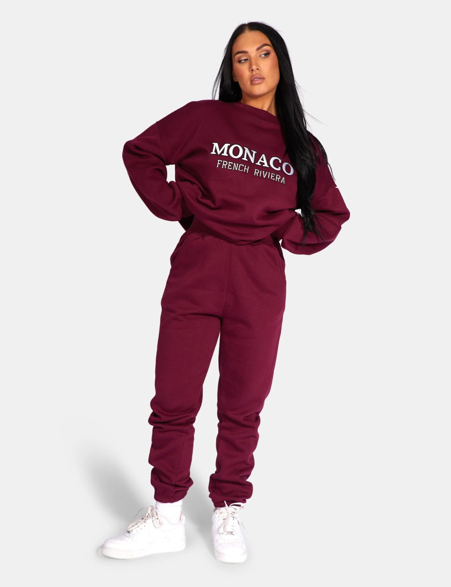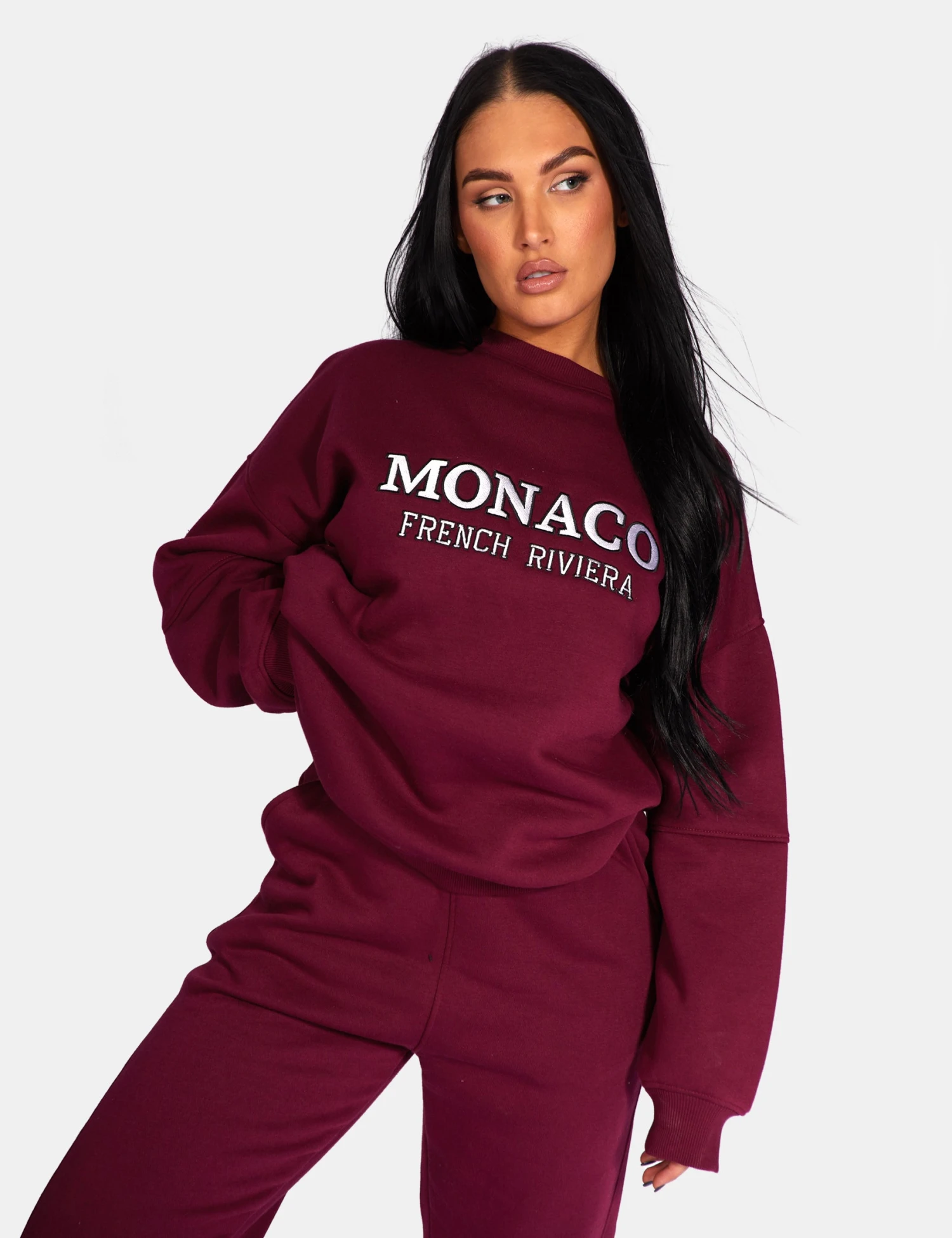 AN OVERSIZED FIT SWEATSHIRT IN BERRY RED WITH MONACO EMBROIDERED ON THE FRONT.