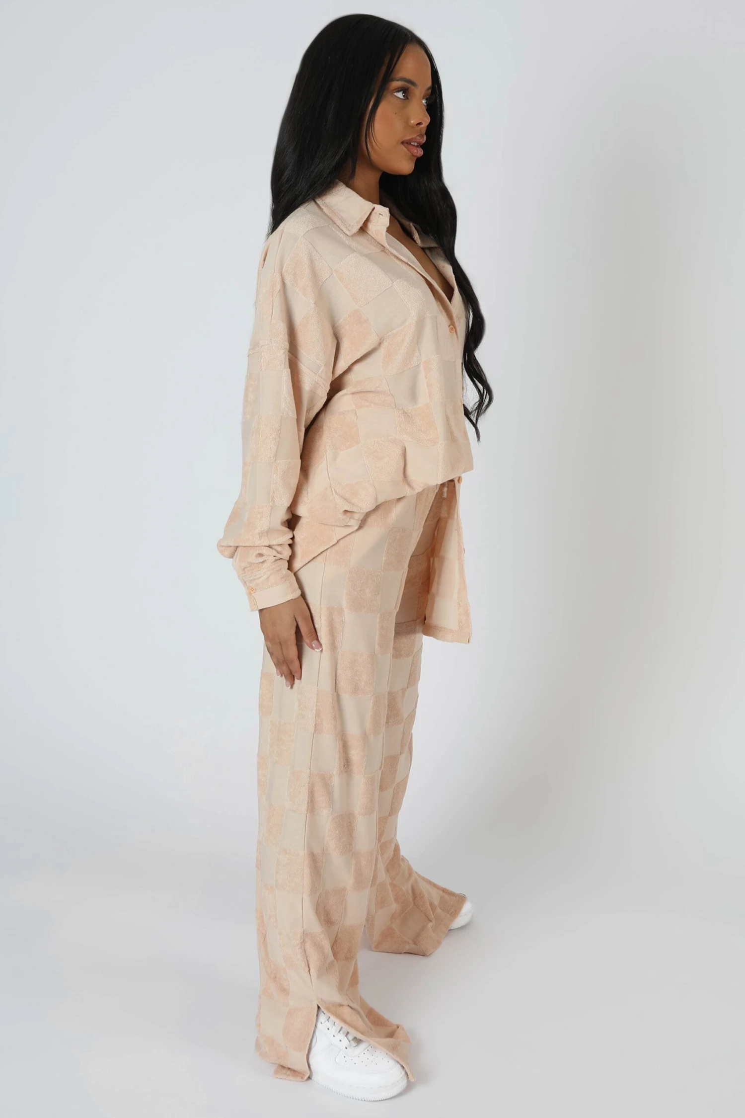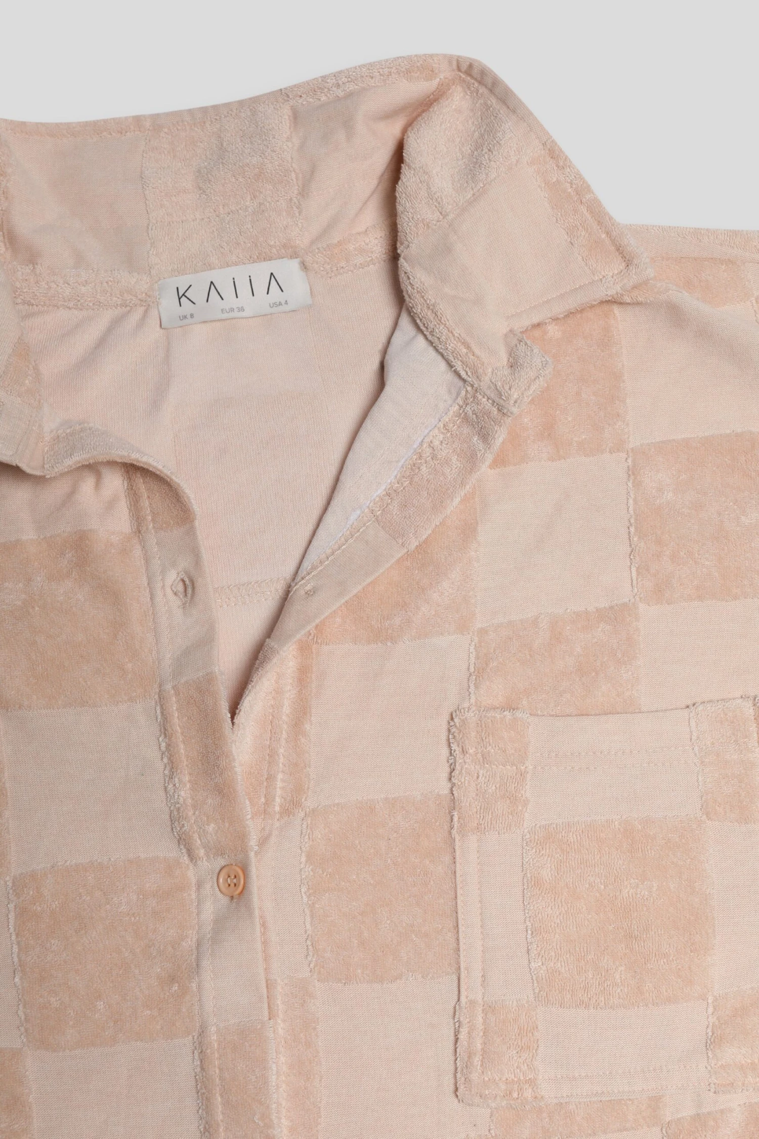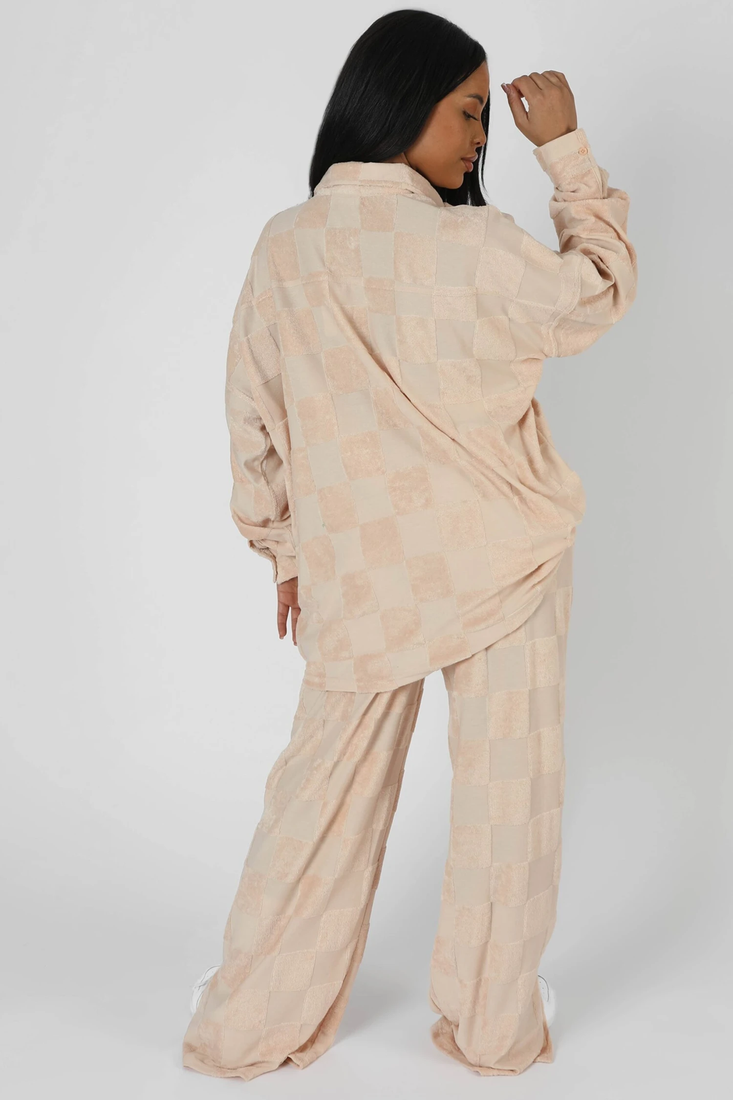 AN OVERSIZED SHIRT IN A SAND TONAL CHECKERBOARD PATTERN