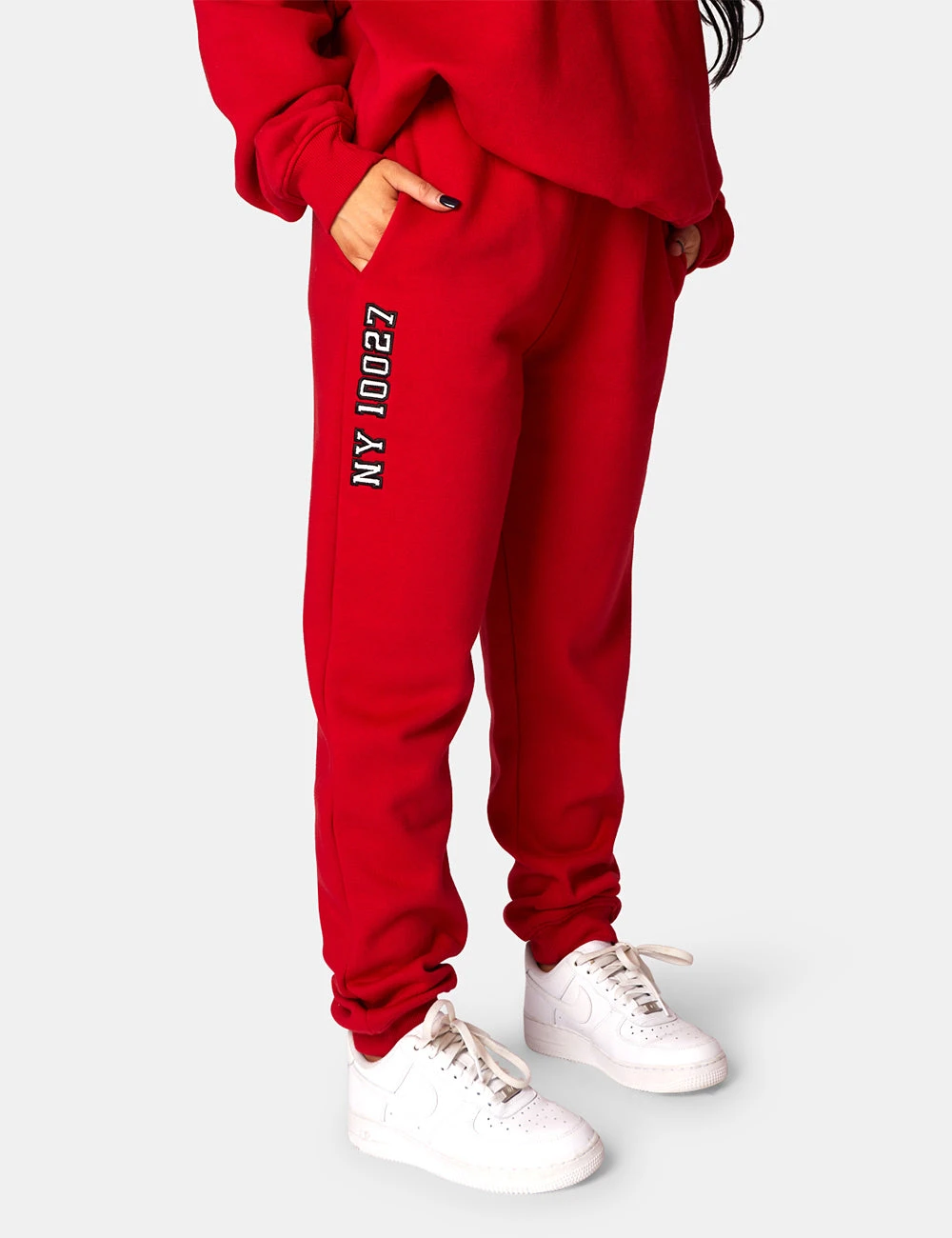 Oversized fit joggers with elasticated waists and cuffs in red featuring embroidery.