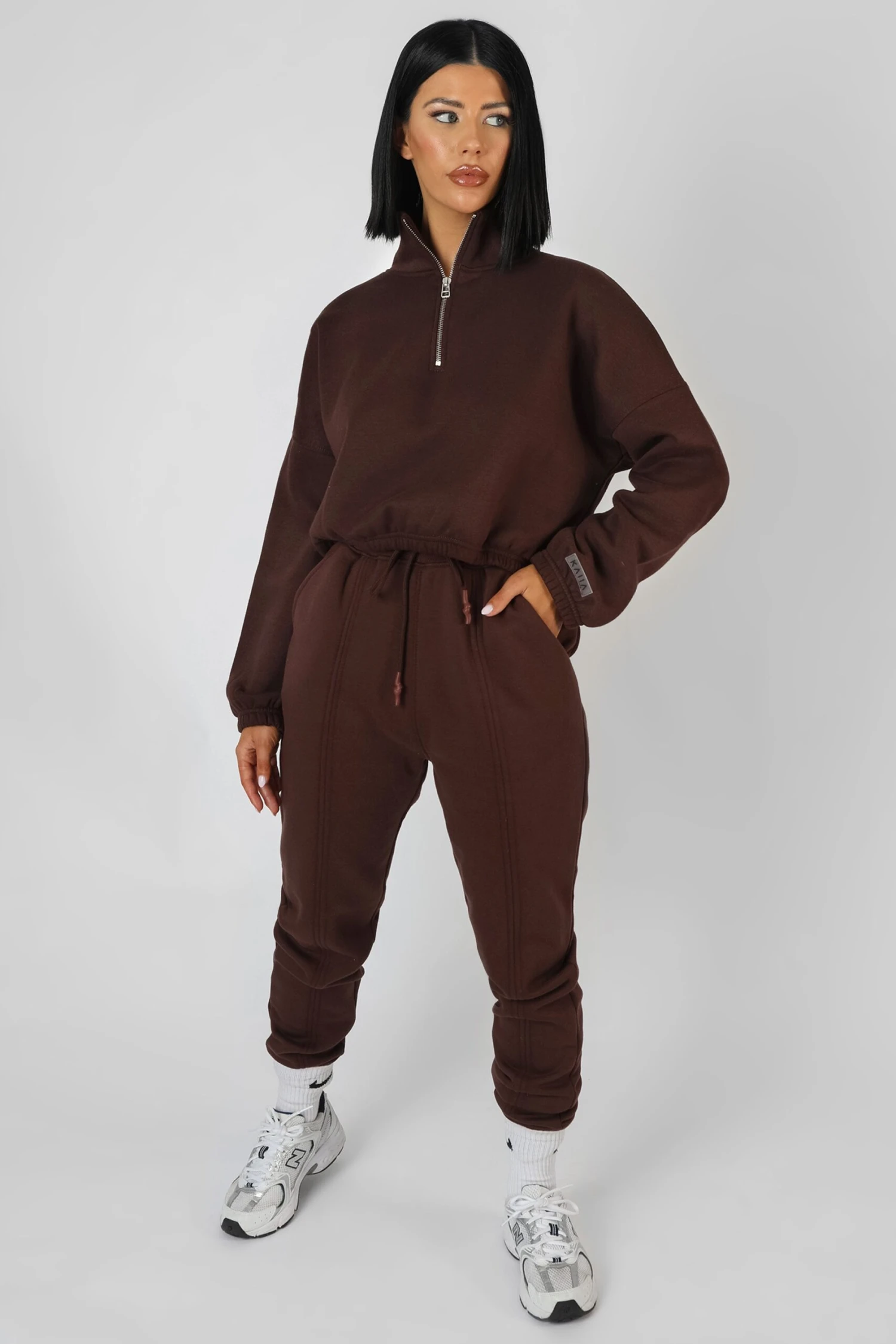 An oversized fit jogger in chocolate featuring an elasticated waist ands cuffs with pockets and seam front details.
