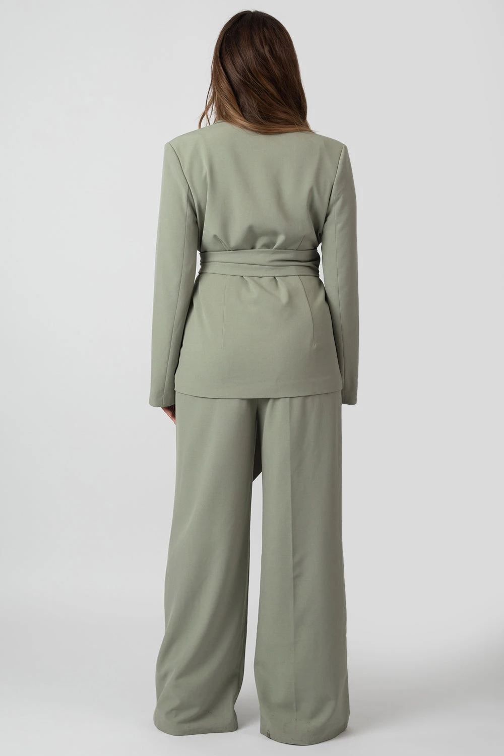 GIVE YOUR SUIT AN UPDATE WITH THESE HIGH WAISTED SAGE TROUSERS FEATURING A TIE WAIST AND FRONT POCKETS. WEAR WITH THE OBI BELT BLAZER FOR THE PERFECT FIT.