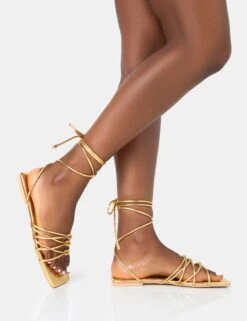 Kelly Gold Pu Lace Up Flat Square Toe Sandals