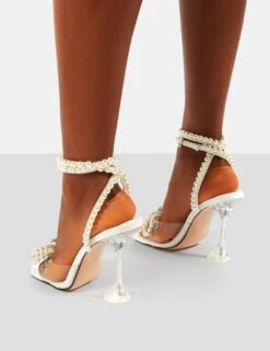 Glimmer White Wide Fit Wrap Around Pearl Square Toe Cake Stand Heels