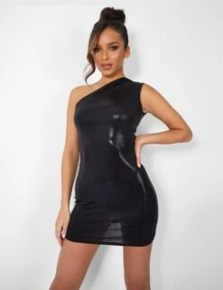 One Shoulder Ruched Metallic Mini Dress Black