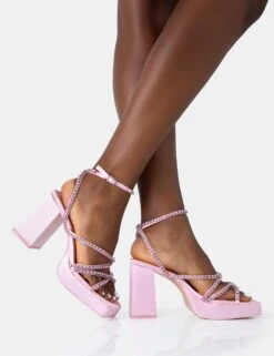 Playout Pink Satin Diamante Strappy Platform Square Toe Mid Block Heels