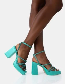 Playout Turquoise Satin Diamante Strappy Platform Square Toe Mid Block Heels