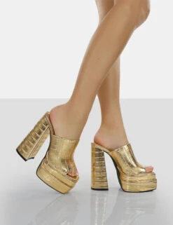 Sky High Gold Croc Chunky Platform High Heeled Mules