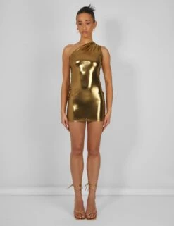 One Shoulder Ruched Metallic Mini Dress Gold