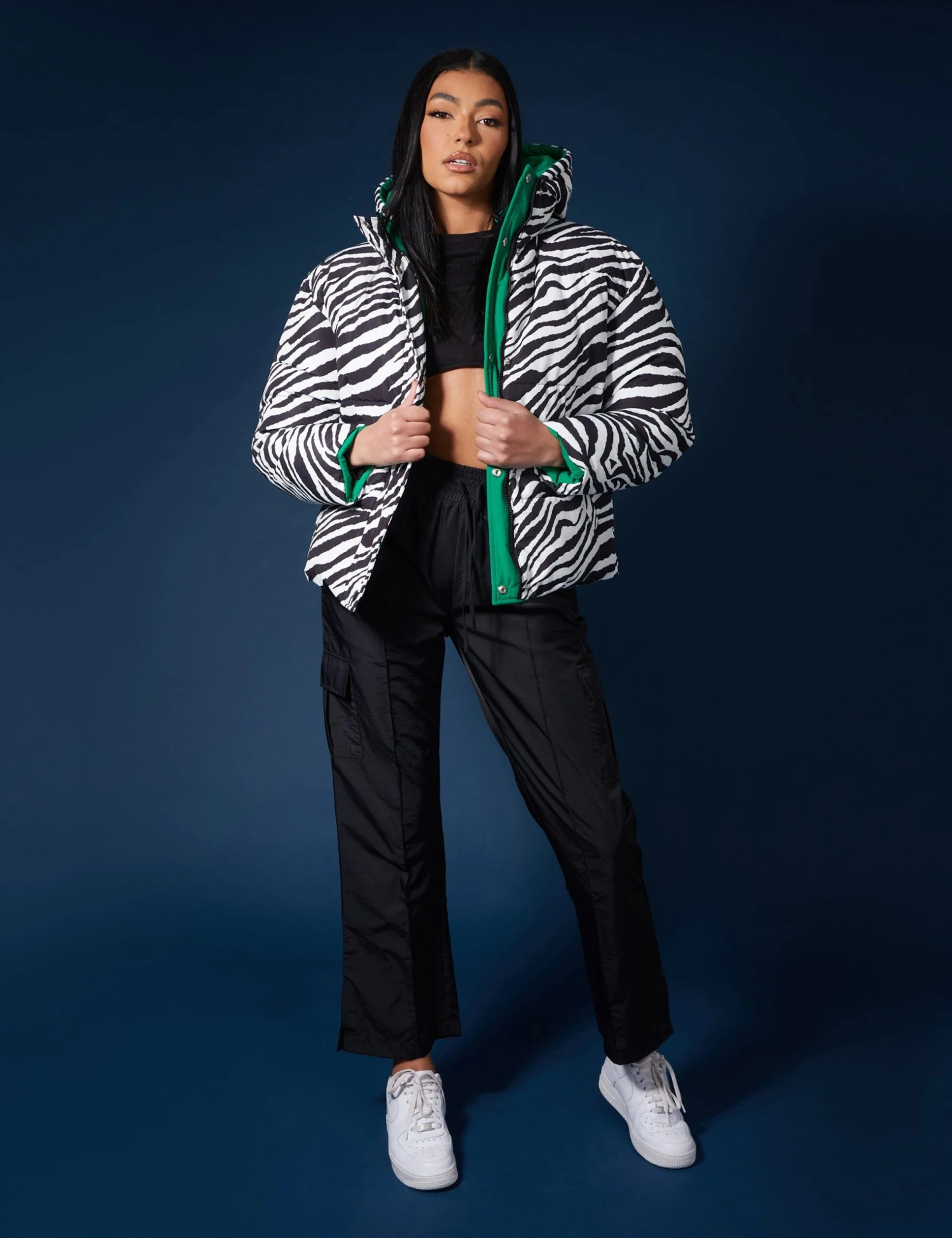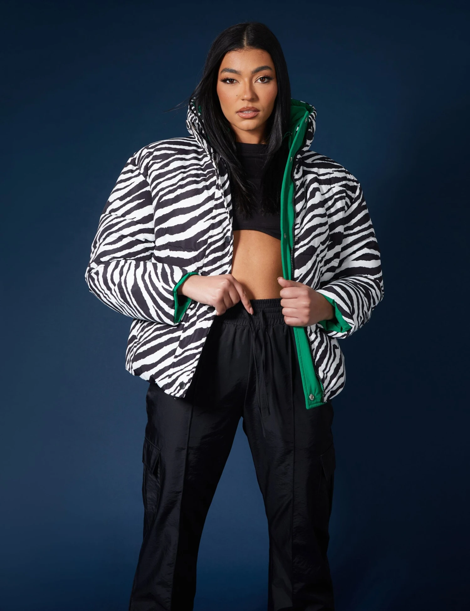 An reversible lined puffer, featuring forest green and zebra pattern material . The model pictured is wearing a UK 8