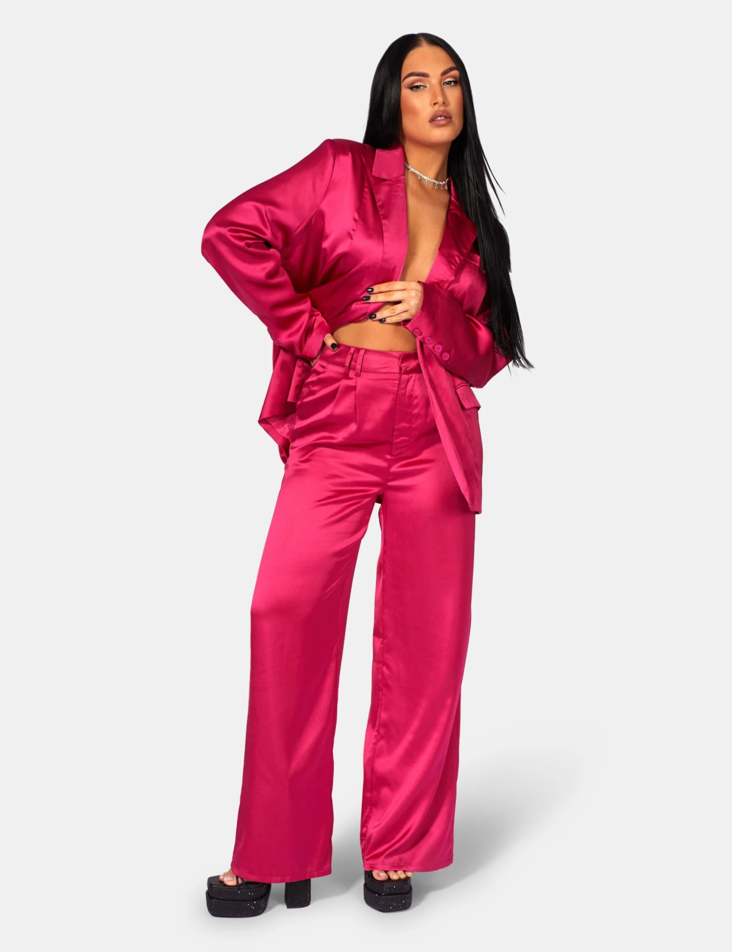 AN OVERSIZED DAD STYLE FIT BLAZER IN PINK SATIN WITH DYE TO MATCH BUTTONS.