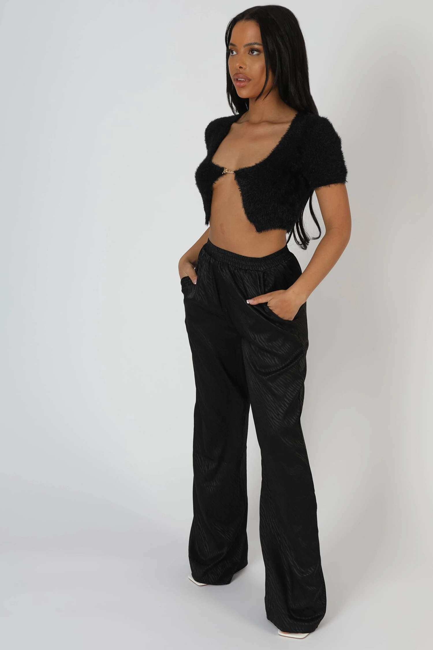 WIDE LEG SATIN TROUSERS IN BLACK WITH TONAL ZEBRA PRINT ON THEM FEATURING AN ELASTICATED WAIST BAND.