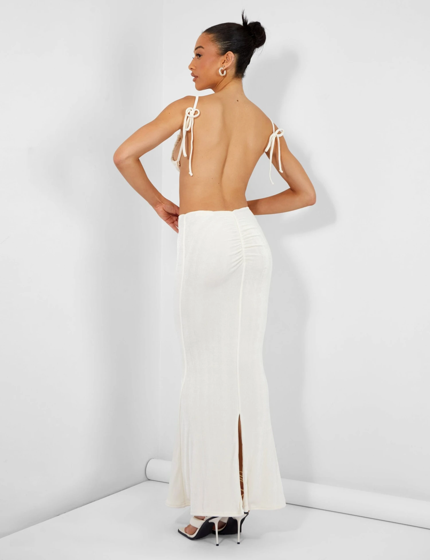 HIGH WAISTED SLINKY MAXI SKIRT WITH A RUCHED BUM DETAIL AND FISHTAIL HEM. COLOUR IS CREAM ECRU