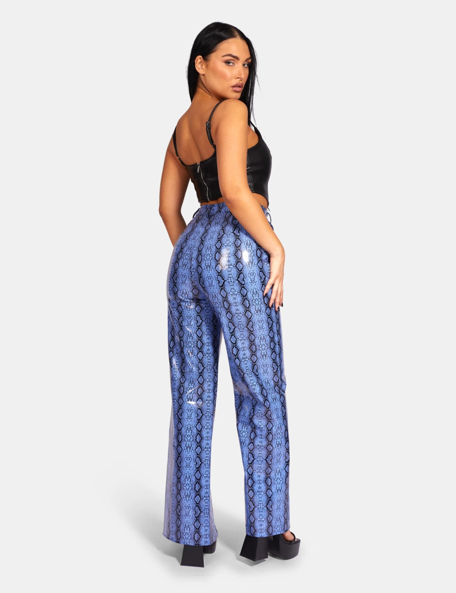 High waisted high shine PU fit spilt flare in blue snakeskin trousers.