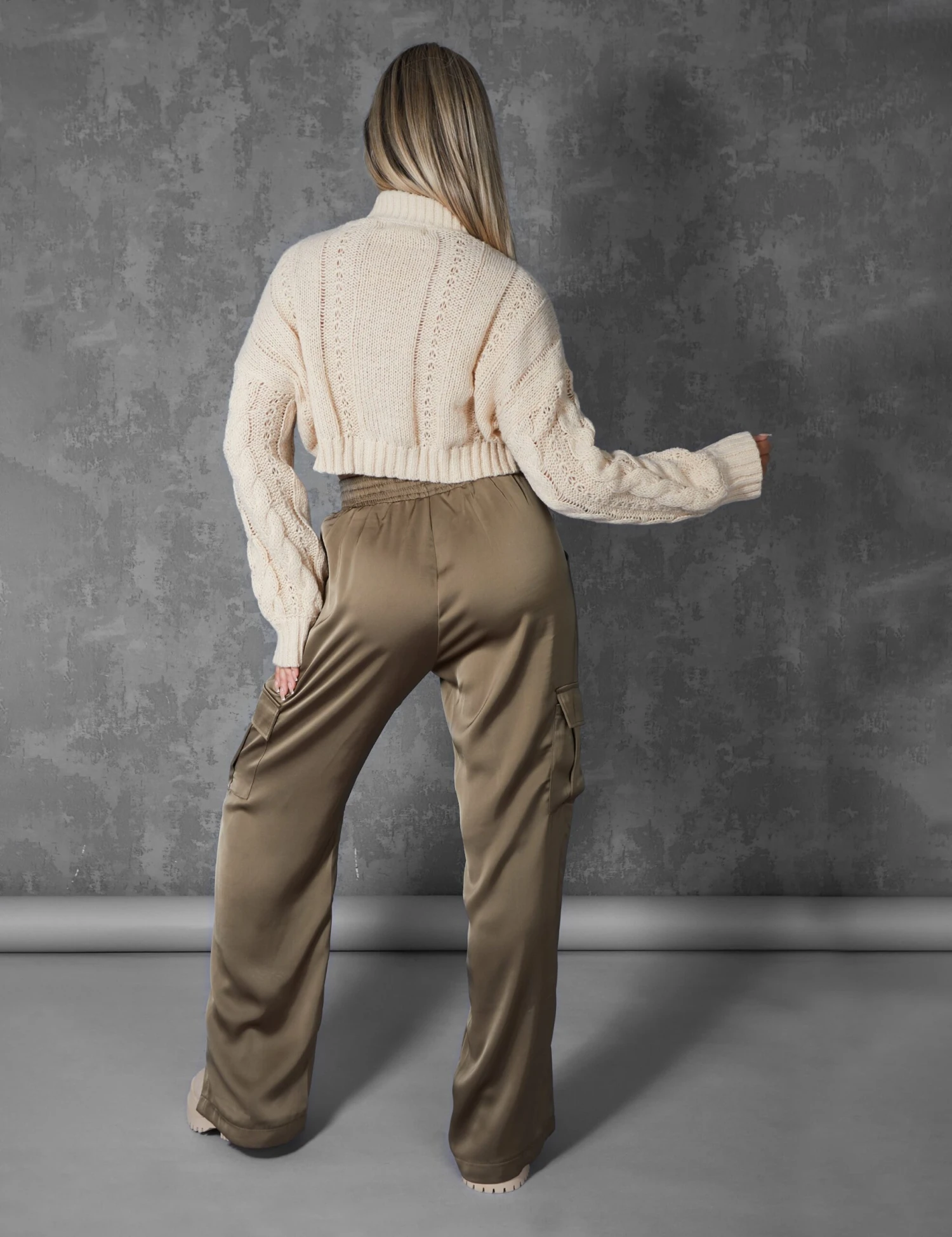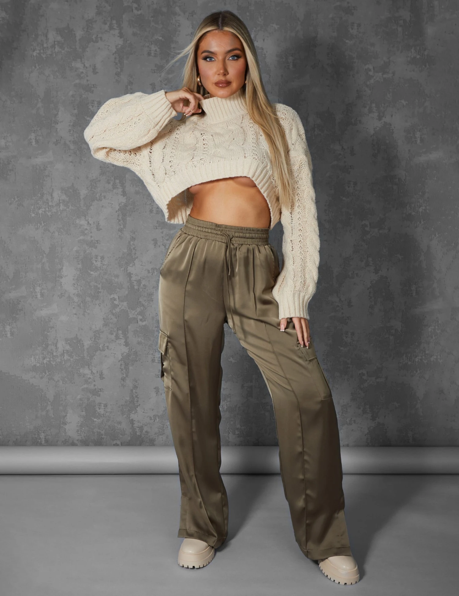 OUR ICONIC HIGH WAISTED ELASTICATED WAIST SPLIT HEM CARGOS NOW IN A SATIN KHAKI