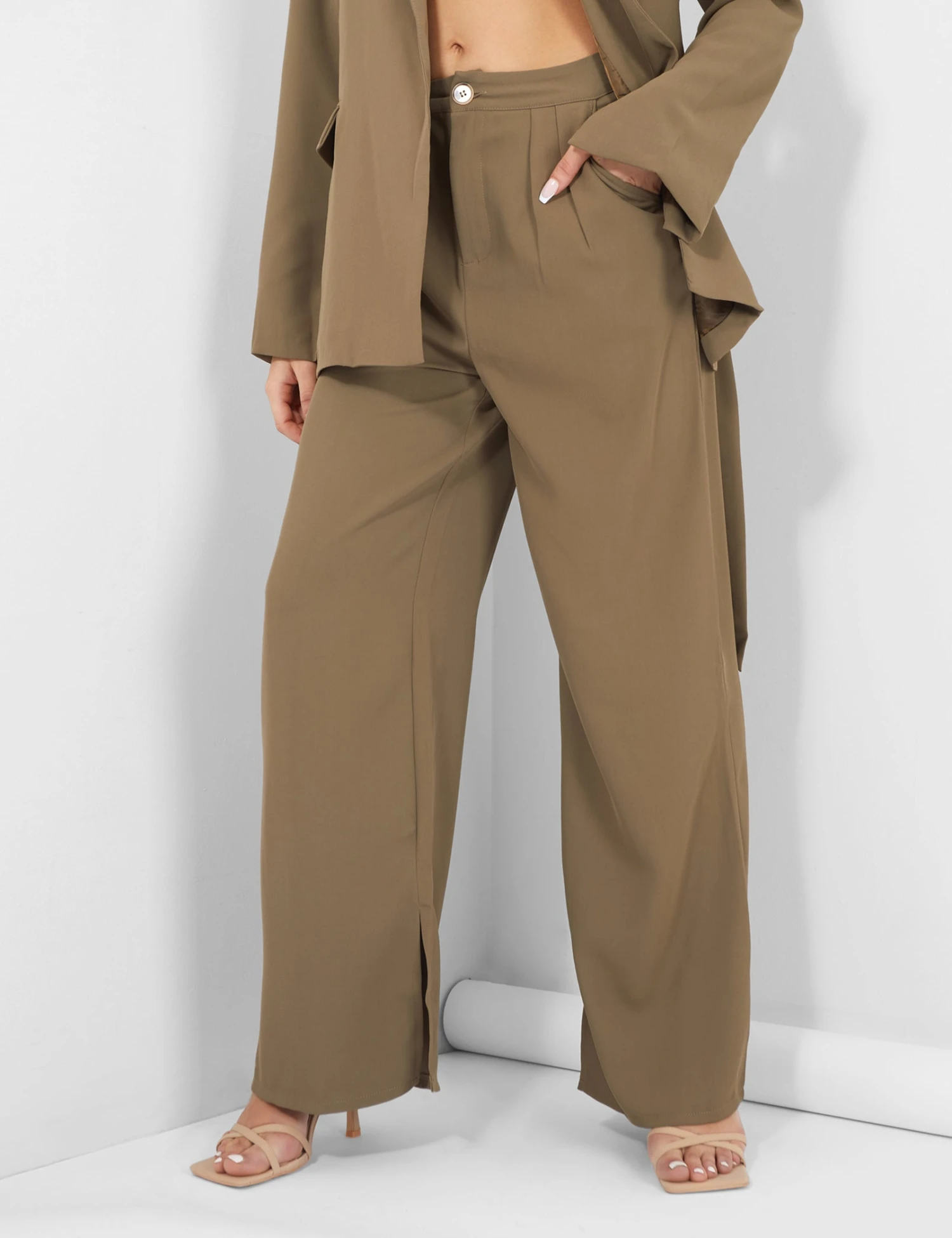 WIDE LEG SPLIT HEM TAILORED HIGH WAISTED TROUSERS IN KHAKI.