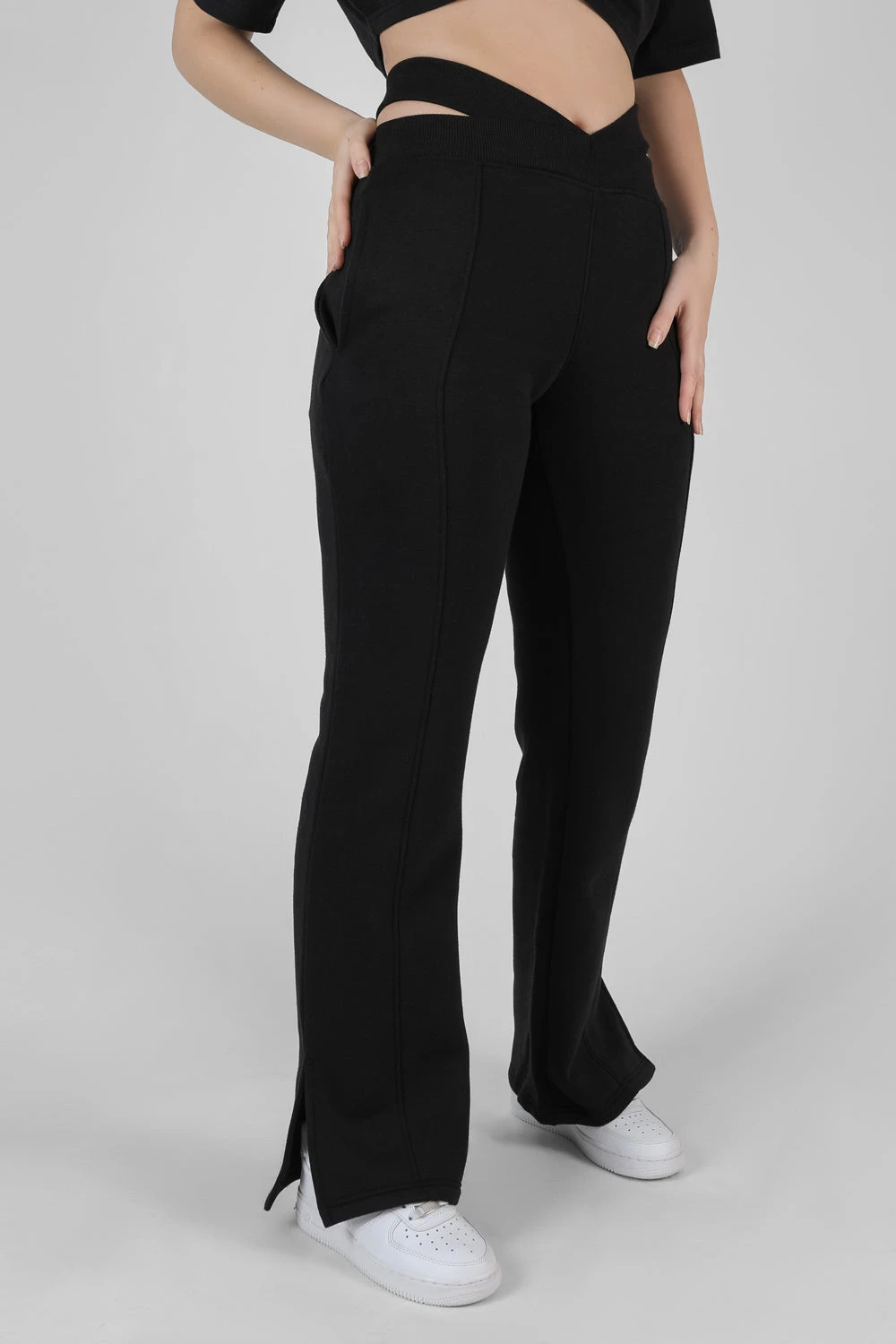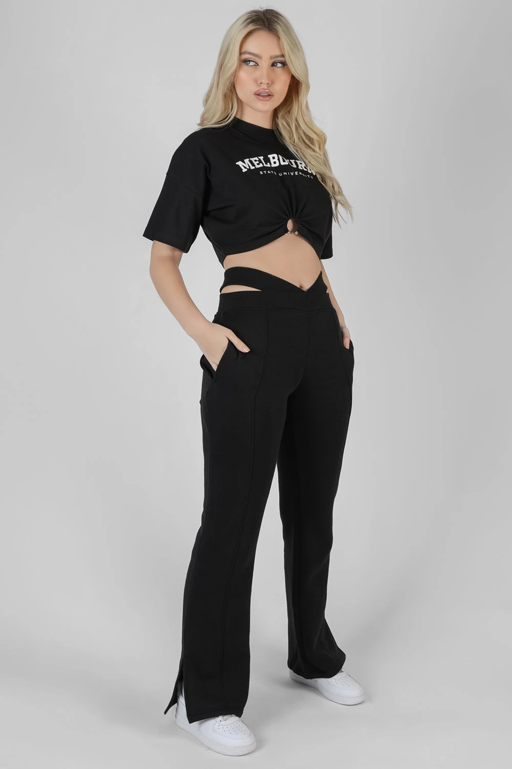 High waisted straight leg joggers in black featuring a flattering V shaped strappy waist.