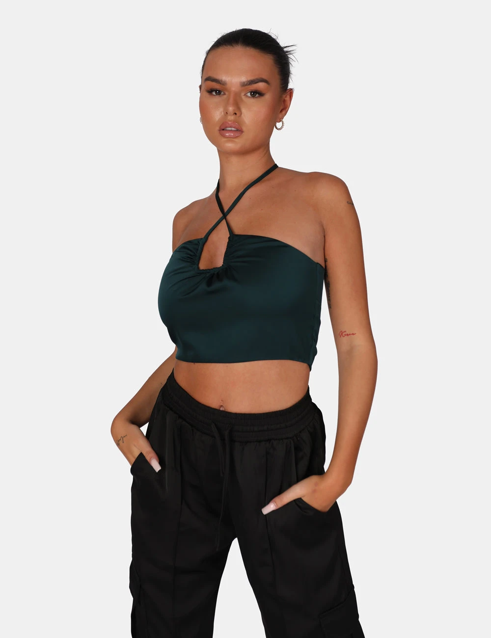 A SATIN CROP TOP IN FOREST GREEN WITH A SQUARE TRIM CUT OUT AND HALTER NECK