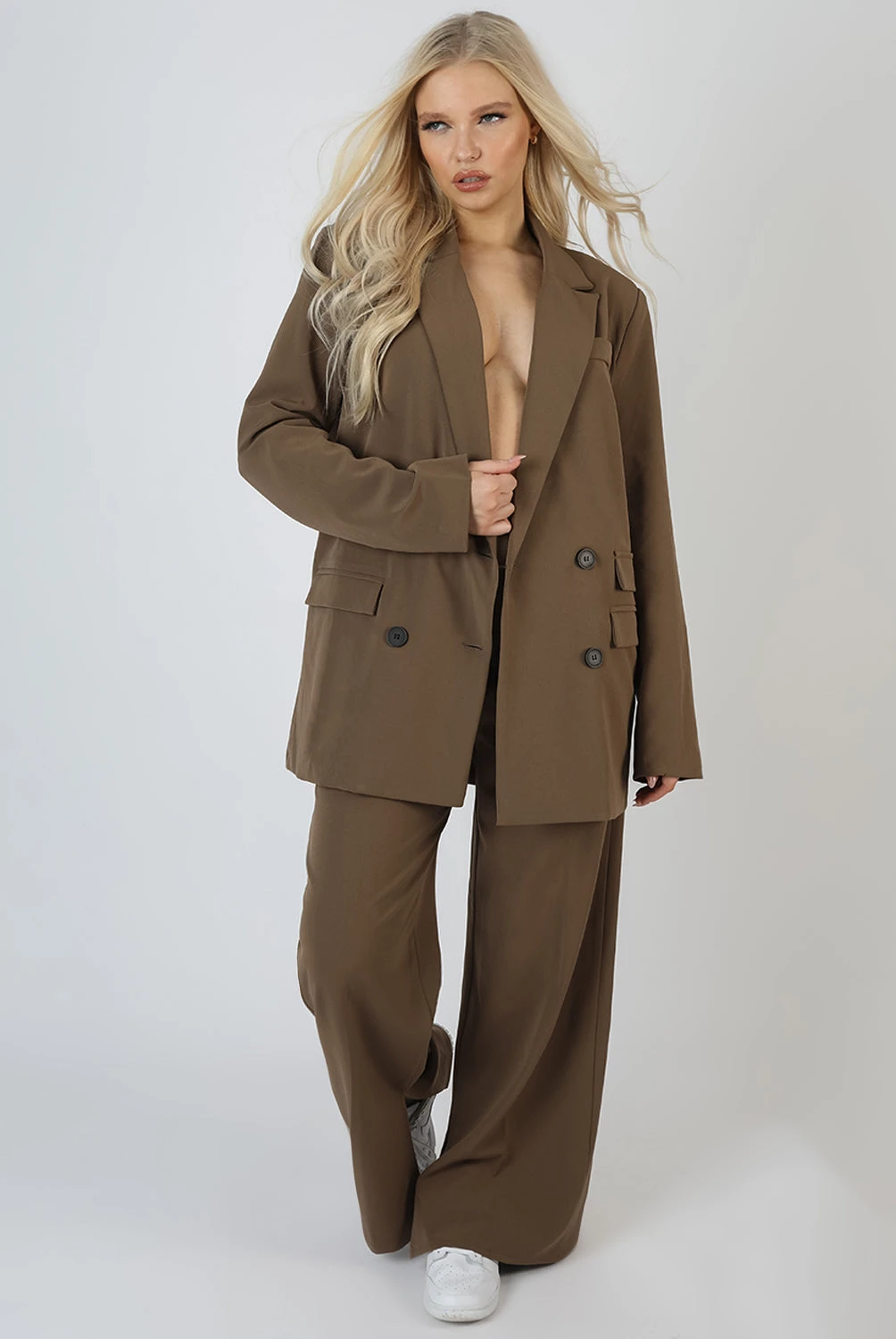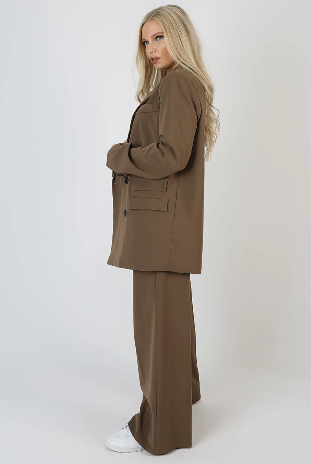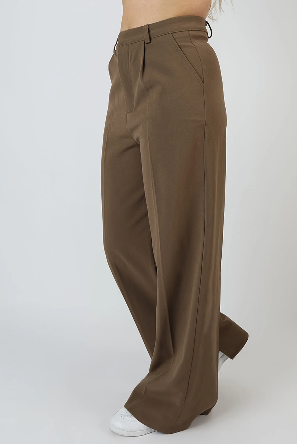 HIGH WAISTED WIDE LEG TAILORED TROUSERS IN MUSHROOM BROWN WITH SPLIT HEM DETAILING.