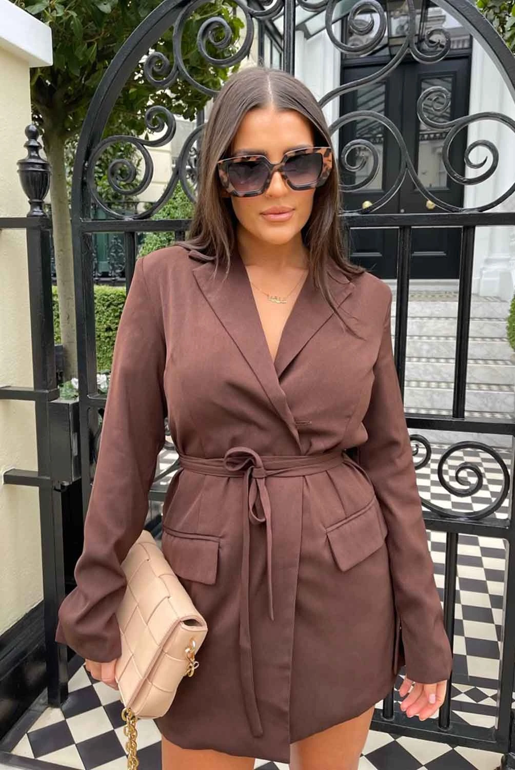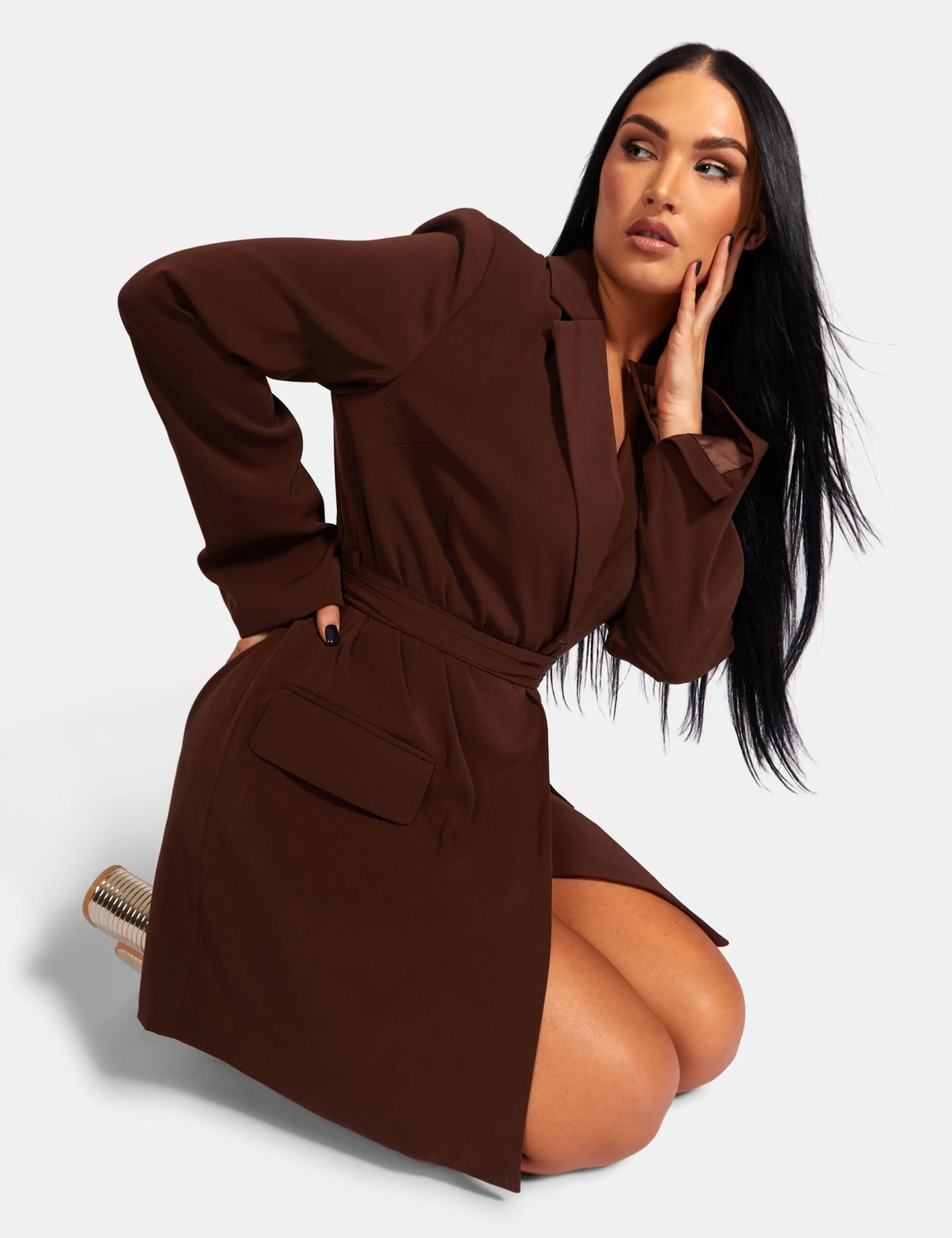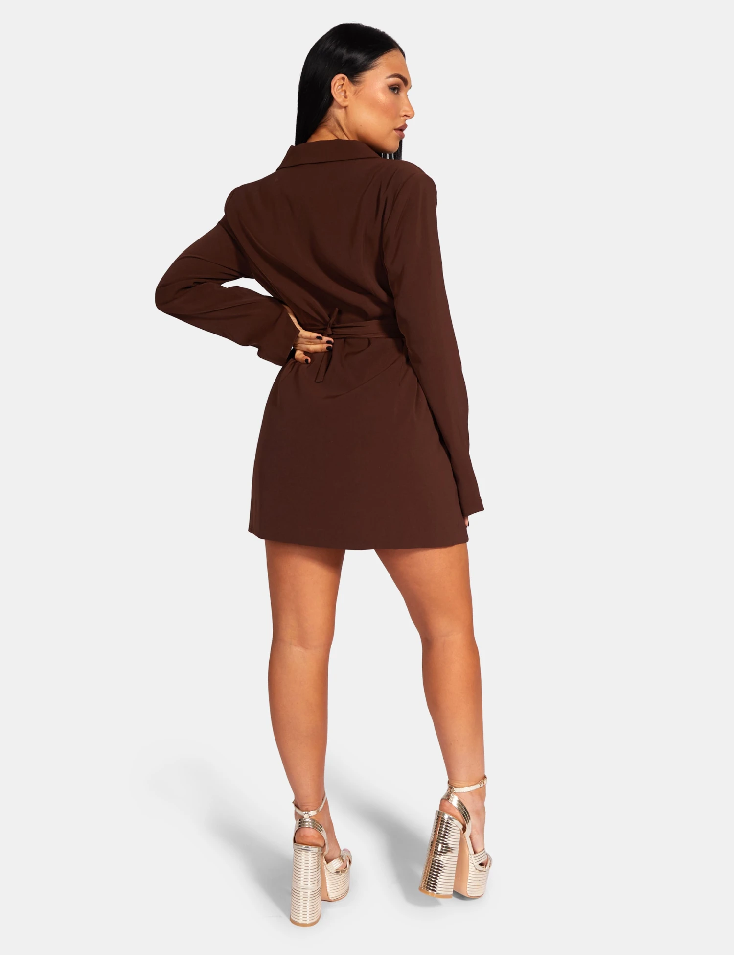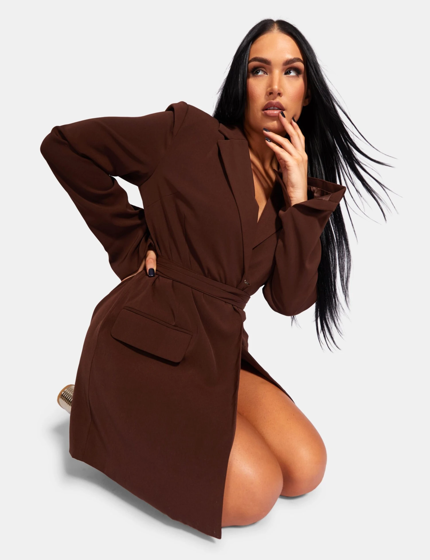 The perfect blazer dress featuring a wrap belt round the waist and front pockets in chocolate.