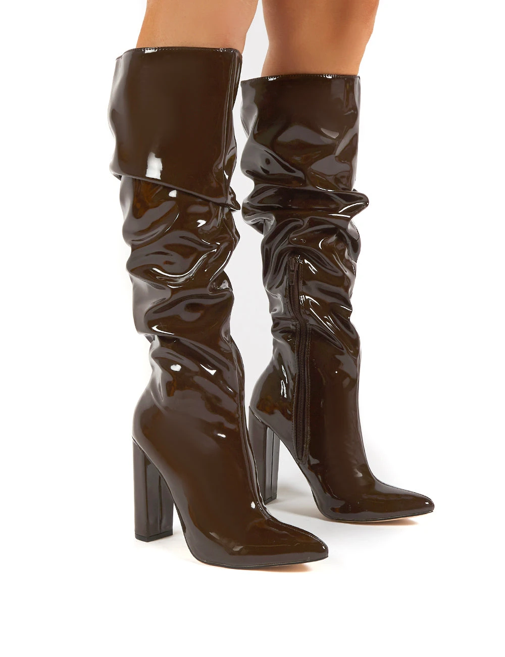 Yours Chocolate Wide Fit Patent Heeled Knee High Block Boots